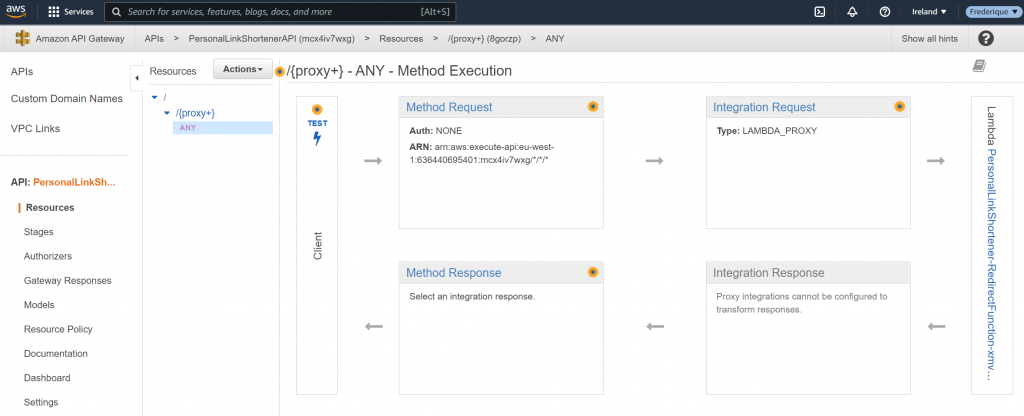 In the API Gateway, I created a REST API. I wanted to get the URL with the full path that is requested. The API Gateway should not check for valid requests, it is the Lambda function that will do the checks. This is different than the normal behavior of the API gateway: in general you will want to specify each valid method and for each methods also the valid HTTP methods (GET, POST, etc). Only valid requests will be sent to specific Lambda functions to deal with each combination of method and HTTP request type.