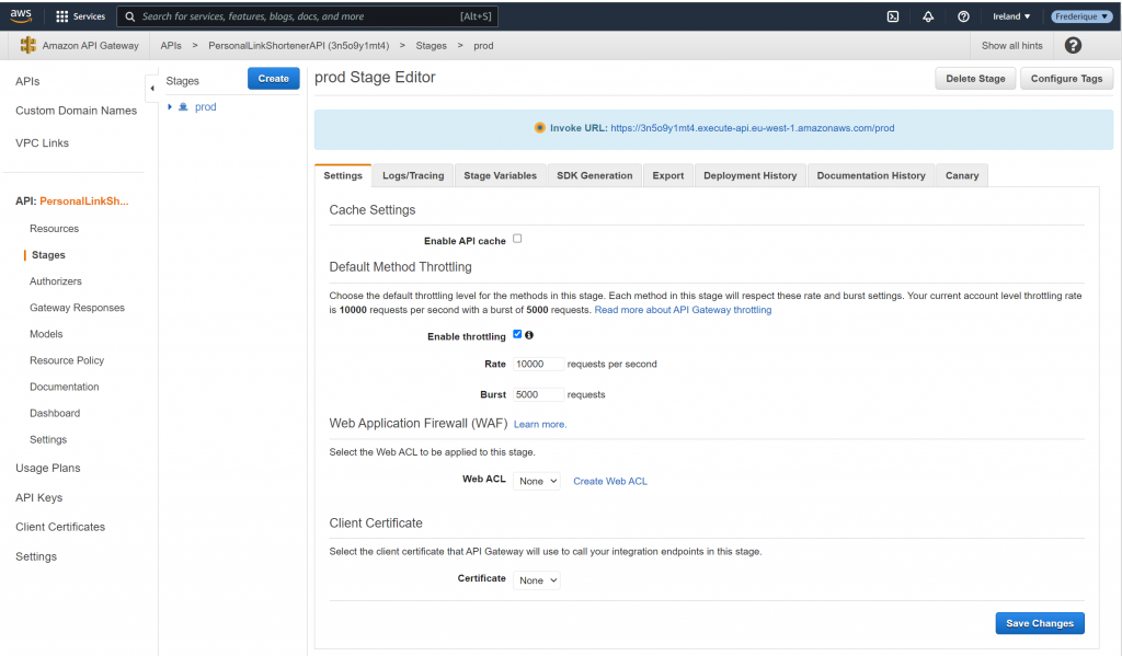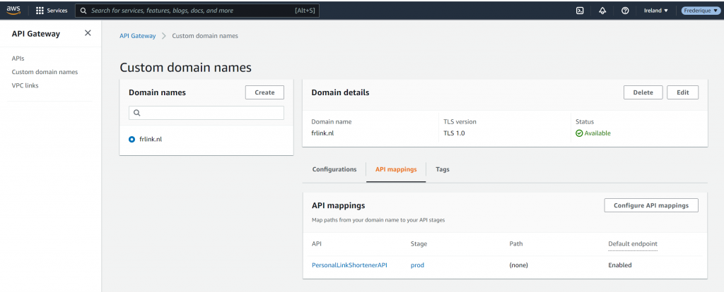 When you select Custom Domain Names in the left menu, you will see the custom domain name frlink.nl. In the API Mappings tab, you can see that this domain name will use the prod stage of the API Gateway with the name PersonalLinkShortenerAPI .