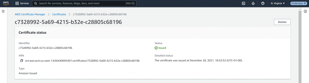 I had some bad experiences in the past when I tried to automate the deployment of public certificates in ACM: there is a limit of 20 deployments per year. Though this can be increased by sending a ticket to AWS support, I didn’t like to run into issues (again). When you want to follow along, you can deploy a new certificate in the us-east-1 region (even though the API gateway is configured as a regional gateway!). When you open the certificate manager, you can see on the left the ARN of the certificate that you need to pass as a parameter of the CloudFormation template.
