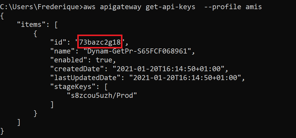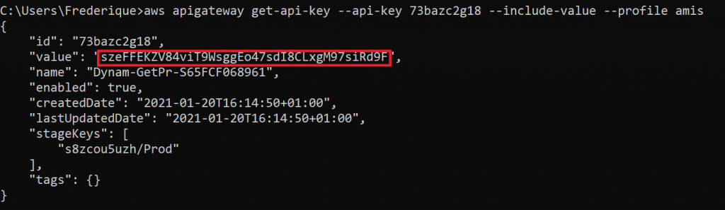 aws apigateway get-api-key --api-key 73bazc2g18 --include-value --profile amis