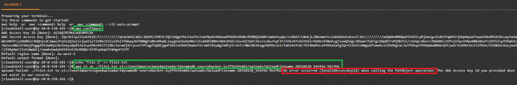 Fortunately, the result is an error: “An error occurred (InvalidAccessKeyId) when calling the PutObject operation: The AWS Access Key Id you provided does not exist in our records”.