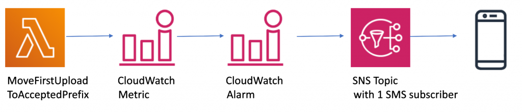 Though it is possible to look in the S3 uploads/ folder for files that remain there, it is better to have a metric that warns you if someone tries to upload several files under the same name. The Lambda function “MoveFirstUploadToAcceptedPrefix” raises an error when the filename cannot be deleted from the DynamoDB table. The metric “Errors” from this Lambda function then triggers a CloudWatch alarm. This alarm sends data to an SNS topic, which sends an SMS to inform operators that this is happening. The operator can search for ERROR in all log streams to find which file generated the error and can look from there.