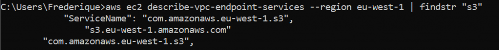Windows: aws ec2 describe-vpc-endpoint-services --region eu-west-1 | findstr "S3"