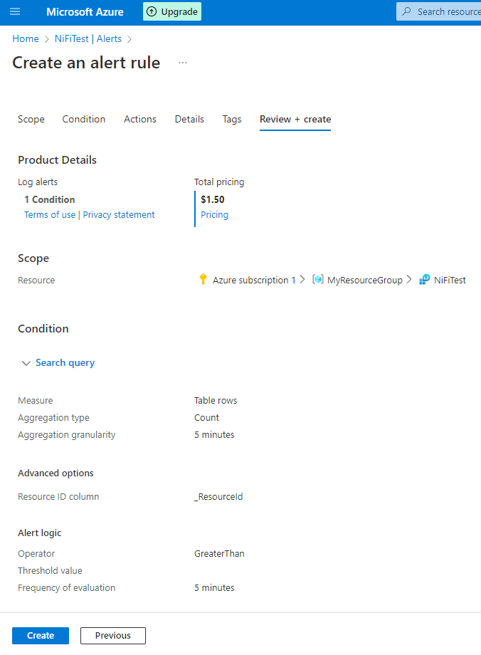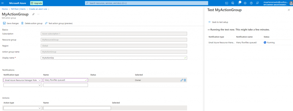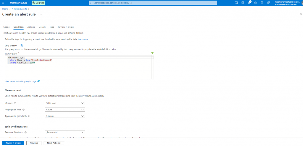This setup gives a basic idea of how you can get NiFi metrics and provenance events into Azure Log Analytics. This is of course not the entire story. The example alert I’ve configured in this blog post does not contain enough information to pinpoint an issue. Also you might want to tweak how often the alert triggers.