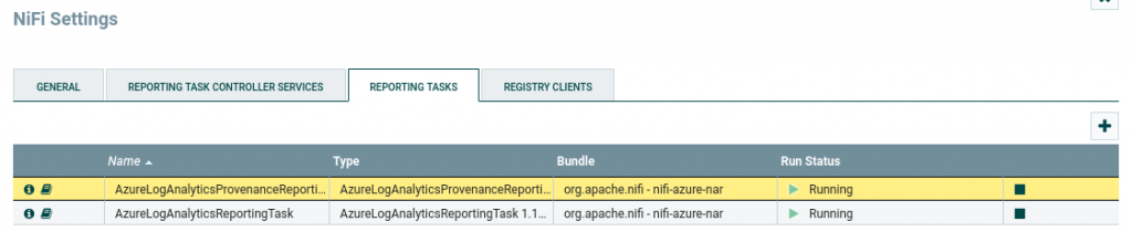 Next in the Reporting tasks tab, you can add the AzureLogAnalyticsReportingTask and/or the AzureLogAnalyticsProvenanceReportingTask.