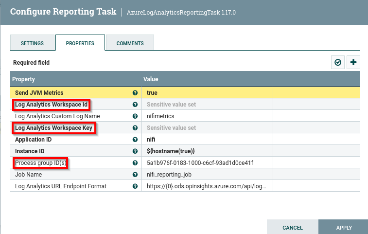 For the Log Analytics Workspace Id you can fill in the previously obtained Workspace ID. For the Log Analytics Workspace Key you can fill in the Primary Key as obtained earlier. It is also possible to specify process groups to monitor specifically. If not specified, the metrics and provenance data will be gathered on global level which might be of less value.