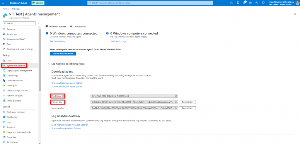 In order to use Log Analytics, you first need to create a Log Analytics workspace. This is pretty straightforward and described here. After you’ve configured a workspace, you can obtain a “Workspace ID” and a “Primary key” under “Agent Management”. You will need this information to configure NiFi with.