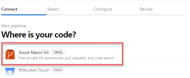 Next we need to select where out code is located. So Choose Azure Repos Git.