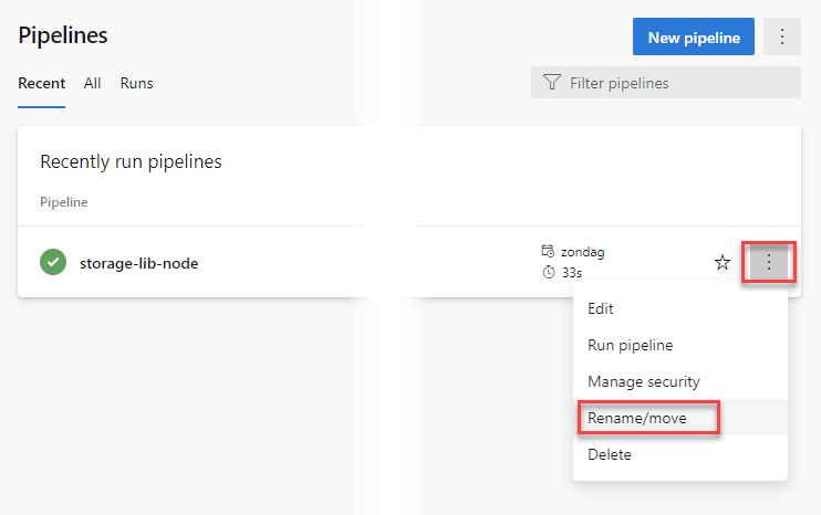 If you go back to the pipeline you will notice that is named (bt default) after the the repository the pipeline was created for. Change the name of the pipeline into for example “Build and publish NPM module storage-lib”. On the pipeline overview page click on the 3 dots to the right of the pipeline and choose “Rename/move”.