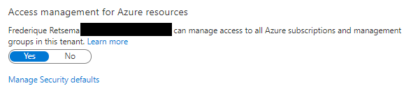 After the creation of this Automation Account, go to the management group called “Tenant Root Group” and use Access Control (IAM) to give the Automation Account “reader” access to all the resources in the tenant. When you are not able to see the details for the “Tenant Root Group”, then first go Azure Active Directory and there choose “Properties”. You might need to switch “Access Management for Azure Resources” to Yes: