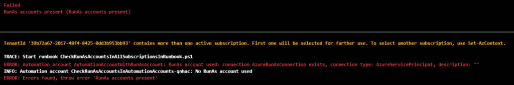 The code in the Runbook that does these checks should be slightly different than the previous PowerShell script: first, we need to logon with “Connect-AzAccount –identity”. Secondly, we should throw an error when automation accounts with RunAs accounts are found.