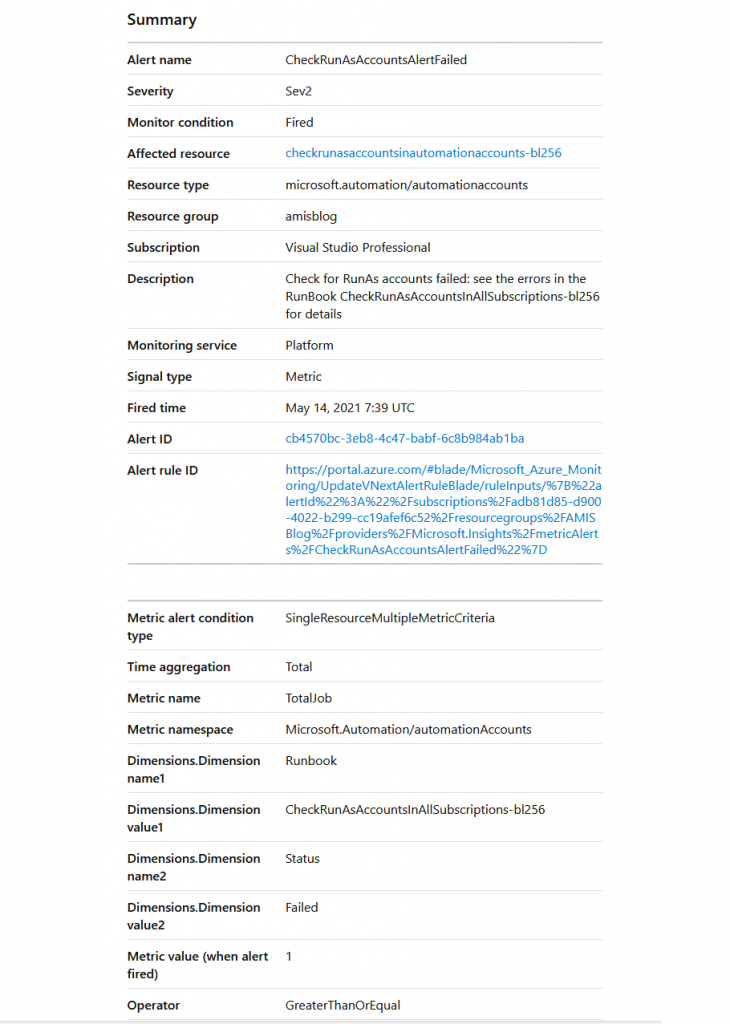 When the checks fail an alert should be raised and an email should be sent. In the alert you can filter for the name of the run book and also for Failed status. In a test environment it is useful to check for failures every 1 minute and also evaluate the alert rule every minute. By doing so, you can test the runbook and when it throws an error you will get an email very fast. In production however, you might save costs by running these alert checks just once per hour.