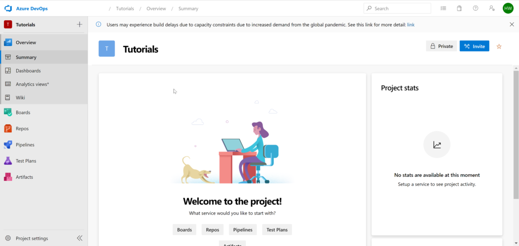 You should see the home page of the project with in the left sidebar the different Azure DevOps modules with Artifacts at the bottom.