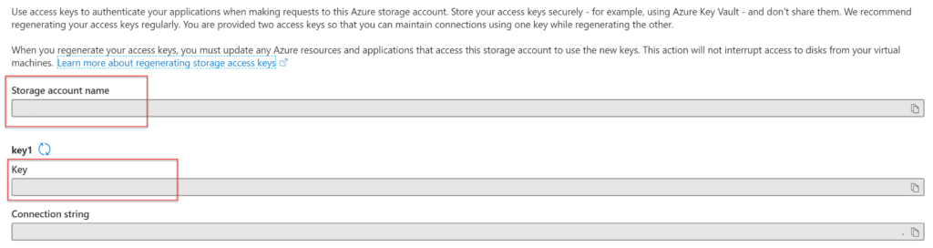 Fill in your storage account name and primary key which can be found on the Azure Portal on the storage account page, tab Access keys.