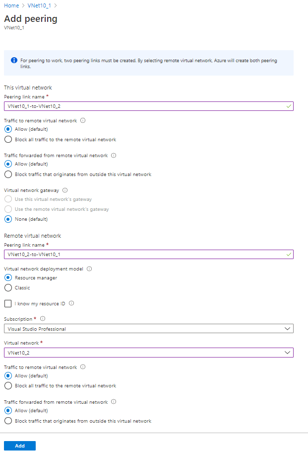 Because I got the VMs via the portal, I also got a public IP address and a network security group for both of them. In the VNet for the first network, I switched on VNet peering, and I used the defaults:
