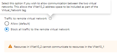 To find out what would happen when I used this switch, I disabled this setting and then tried the ping again. And, to my surprise, the pings were still answered. The reason for this is also in the information balloon: when you enable this setting, then VNet10_2 address space (10.2.0.0/16) is added to the Virtual_Network tag for the first network. It turns out that this setting is not blocking any traffic, as the name suggests. This setting is only used in the Network Security Group to allow (or not allow) all traffic between the connected networks.