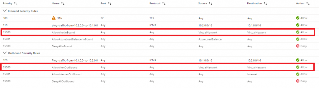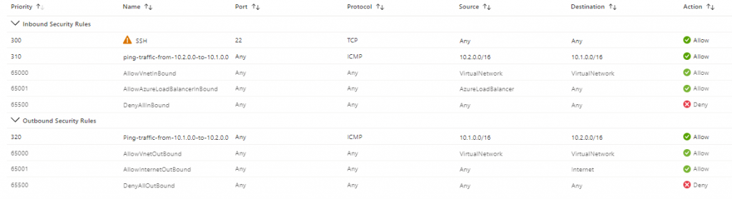 I just wanted to do pings from the first network to the second network. So I configured the two Network Security Groups (NSGs) to allow ping traffic between the two networks. For example, the NSG for the first network looks like: