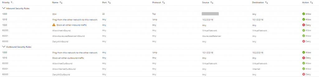 So instead of deleting my own security rules for ICMP traffic, it would be better to delete the default rule that allows the network traffic for VirtualNetwork. Unfortunately deleting these default rules is impossible, so I added an extra block rule for all the traffic that is not explicitly mentioned in other security rules with a higher priority than the default rules. And while I was doing that, I was also securing port 22 traffic to only allow traffic from my own PC….