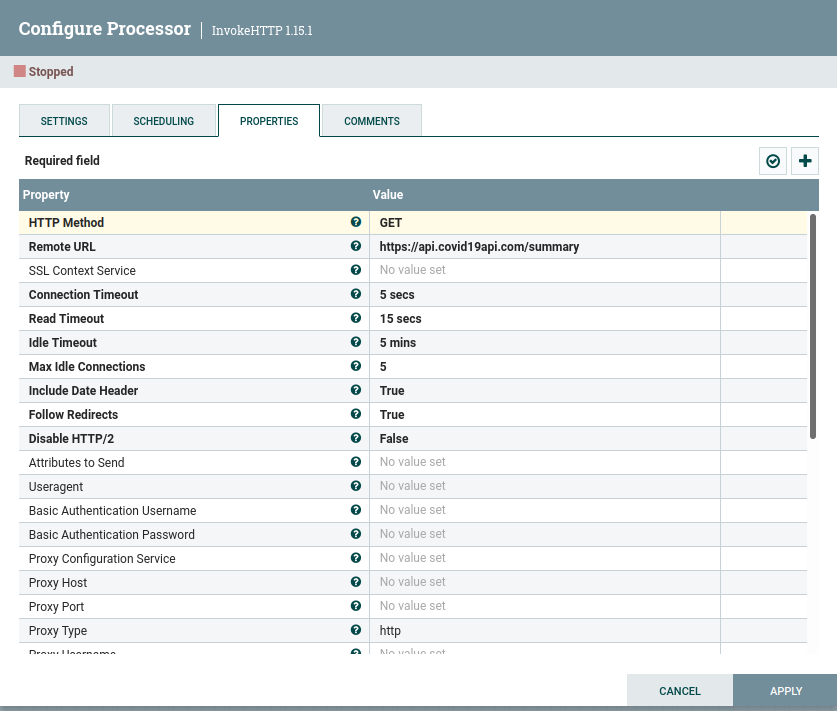 The InvokeHTTP processor can be used to call REST APIs. I’ve configured this as follows: