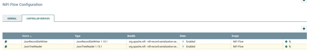 Important to notice is that I use the JsonTreeReader in order to collect the entire JSON record. The JsonTreeReader and JsonRecordSetWriter are controller services which have a default configuration.