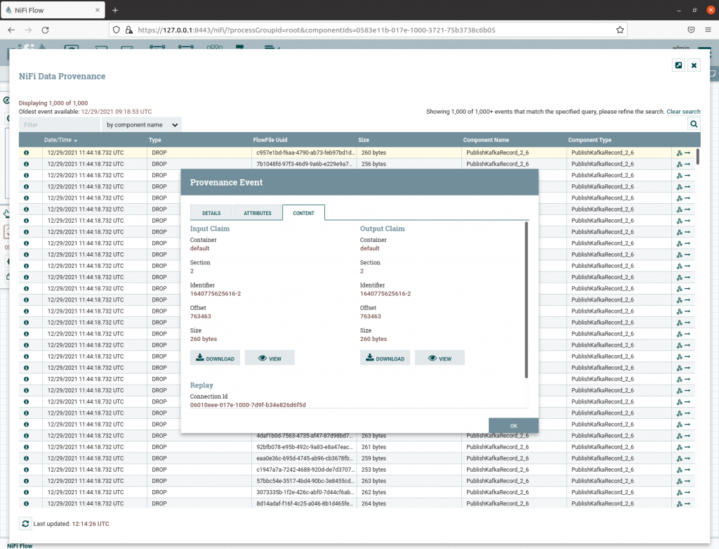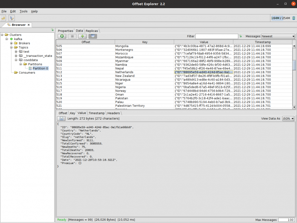 When you enable your processors, you can run the processor which calls the REST API once. Of course, you can also schedule the execution of the InvokeHTTP processor to for example fetch data daily. It will read the data, the data will be split into individual FlowFiles and these FlowFiles will be produced to a Kafka topic which uses the country name as its key.