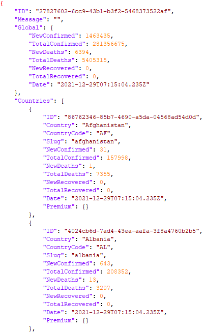 I’ve used a GET request on the following API: https://api.covid19api.com/summary. This gives you a JSON like:
