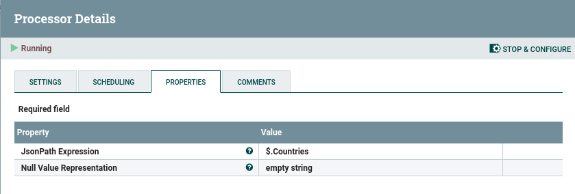 The SplitJson processor can split the input JSON into separate FlowFiles per country. This comes in handy when writing individual records to the Kafka topic.