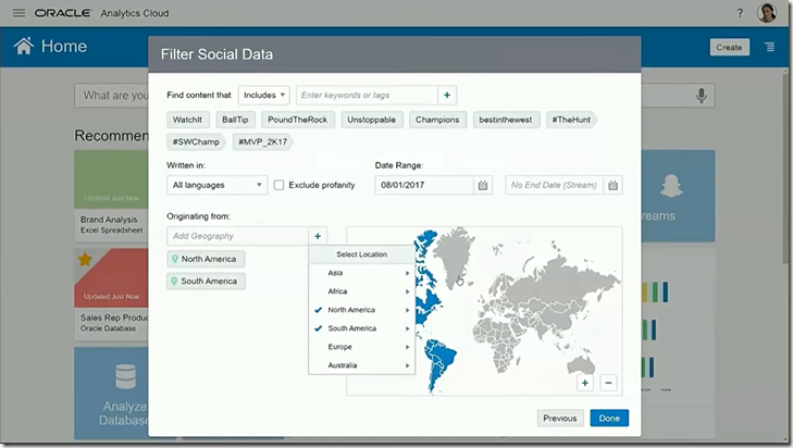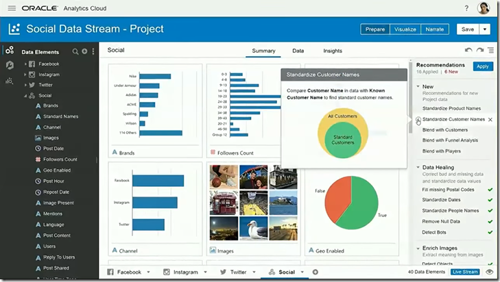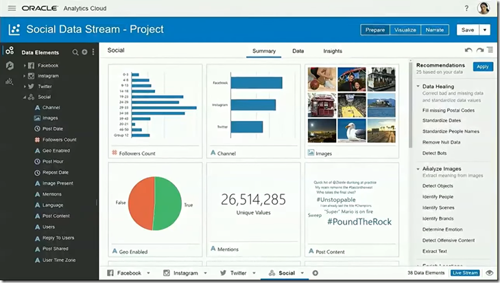 The initial data load is presented for the new Social Data Stream project on the Prepare tab. The Analytics Cloud comes with recommendations (calls to action) to cleanse (or “heal”) and enrich the data. Among the potential actions are correcting zip-codes, extracting business entities from images, complete names and enrich by joining to predefined data sets such as players, locations, team names etc.