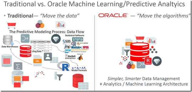 The ability to perform predictive analytics inside the Oracle Database platform is presented as a major usp compared to other vendors: