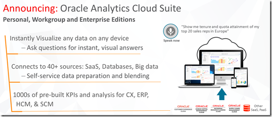 The Oracle Analytics Cloud – in Personal, Workgroup and Enterprise Editions (!) – provides visualization for many different data sources. I am not sure how this suite and the Data Visualization CS are related.