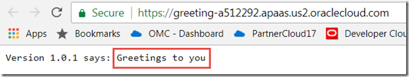 When done, the application can be accessed. This time, the greeting returned is the one specified in the the deployment descriptor deployment.json (as environment variable) and picked up by the application at run time (using