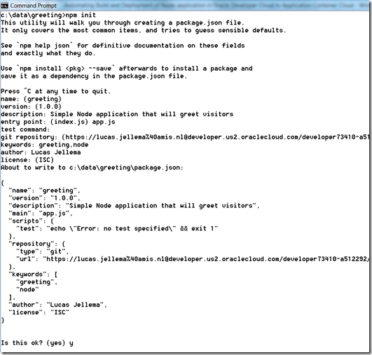 To have the application build we can create a build job in Developer Cloud Service that creates the zip file that is suitable for deployment; this zip file needs to contain all sources from Git and all dependencies (all node modules) specified in package.json. The job is triggered by changes on the master branch in the Git repo. Note: the build job ideally should also perform automated tests – such as described by Yannick here.