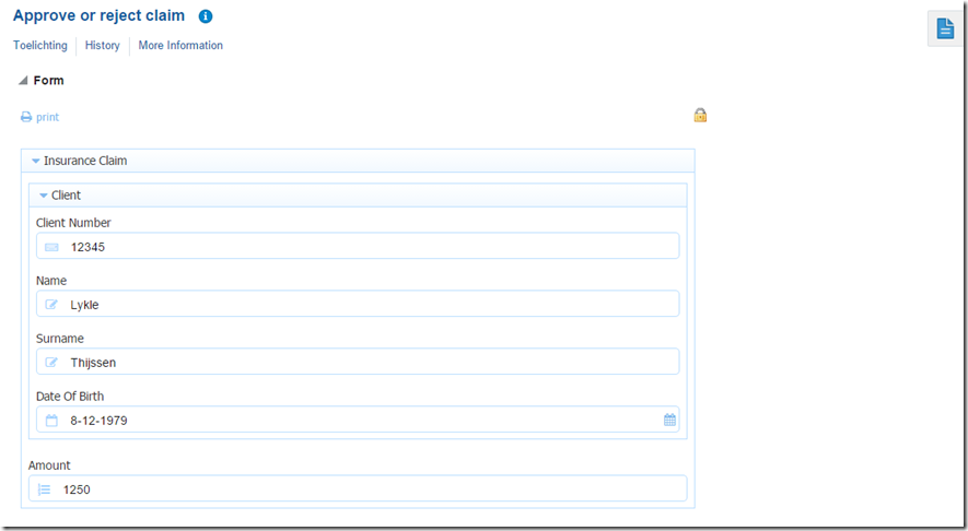 From the main page, I start my Insurance Claim application. It opens the Web Form that I’ve created for this task and a small blue document icon has appeared on the right side of my screen.