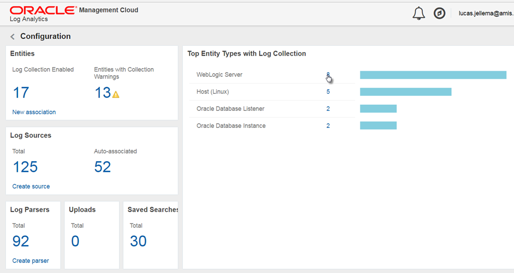 At this point, no logging is actually flowing to the OMC cloud. The entities currently listed as targets are however already visible, with some associated log sources (in Log Analytics console, click configuration):