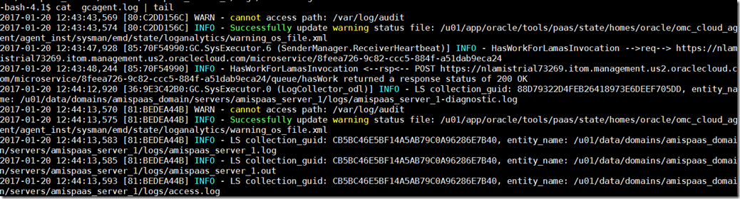 inspect log file /u01/app/oracle/tools/paas/state/homes/oracle/omc_cloud_agent/agent_inst/sysman/log/gcagent.log