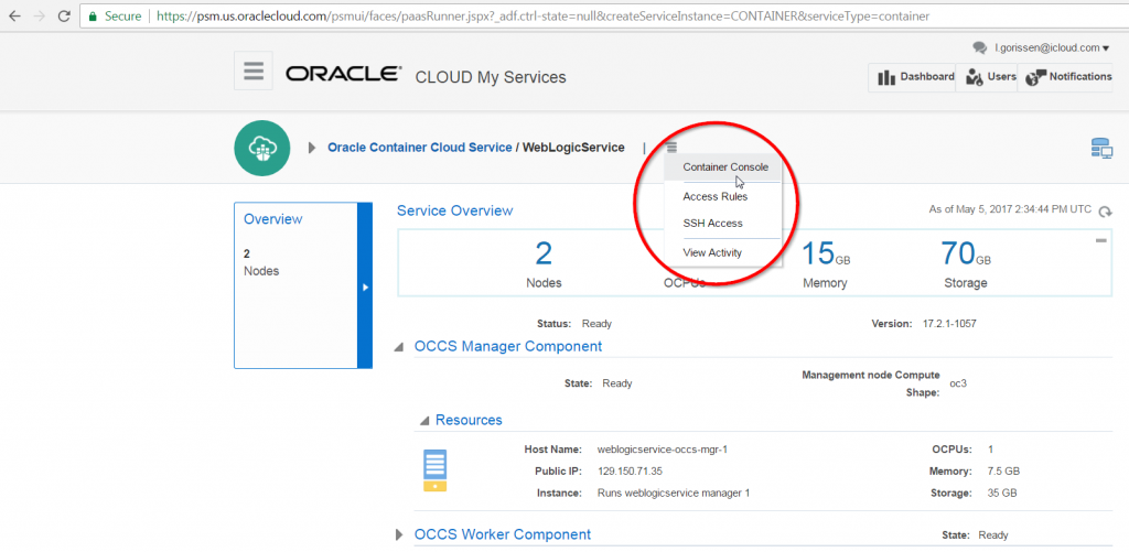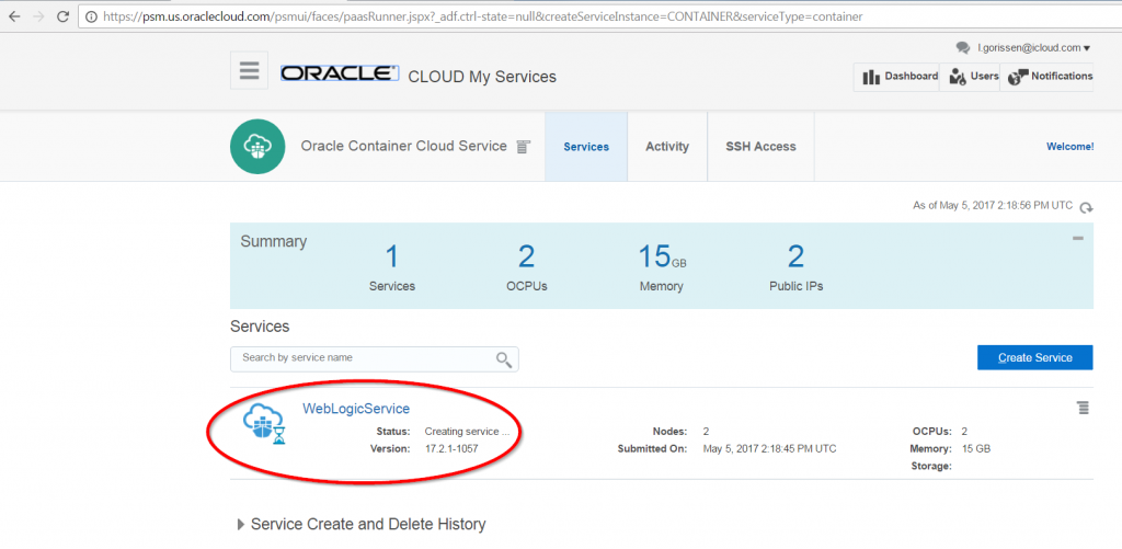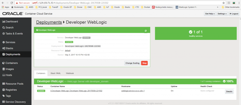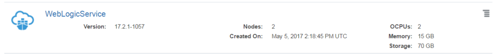 Click on the ‘WebLogicService’, which brings you to a more detailed overview of your created Container Cloud Service: