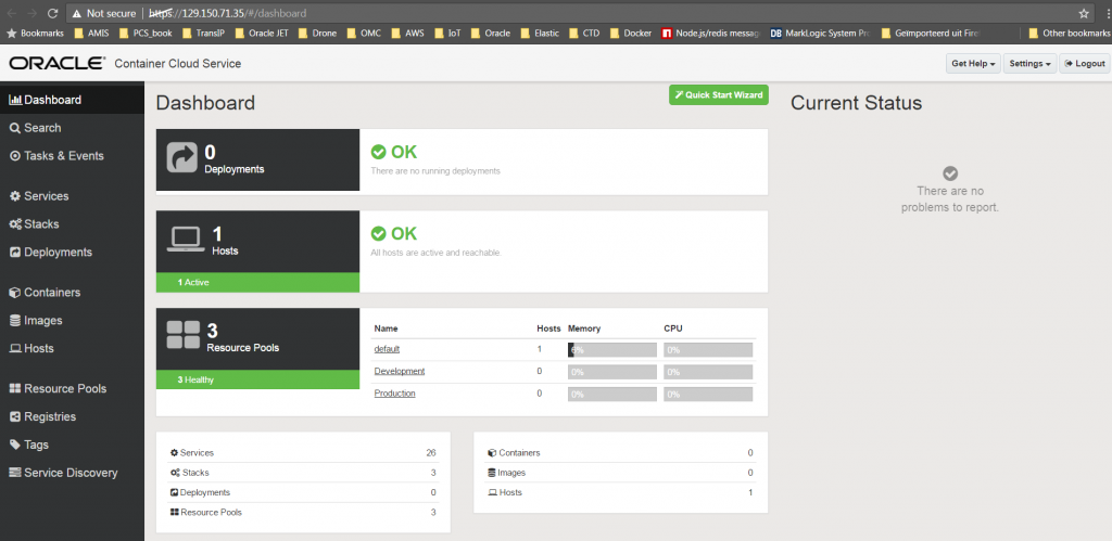 In this console, the main concepts of the Oracle Container Cloud Service are clearly visible: