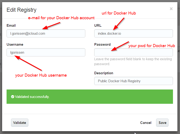Click the Edit button and add the authorization details for the private Docker Hub registry: