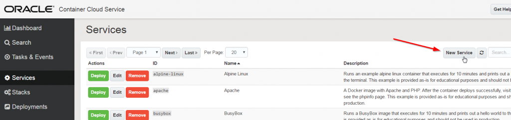 Next, we’ll create a Service that describes how we want to deploy the WebLogic container image. Goto the Services page and click on the New Service button: