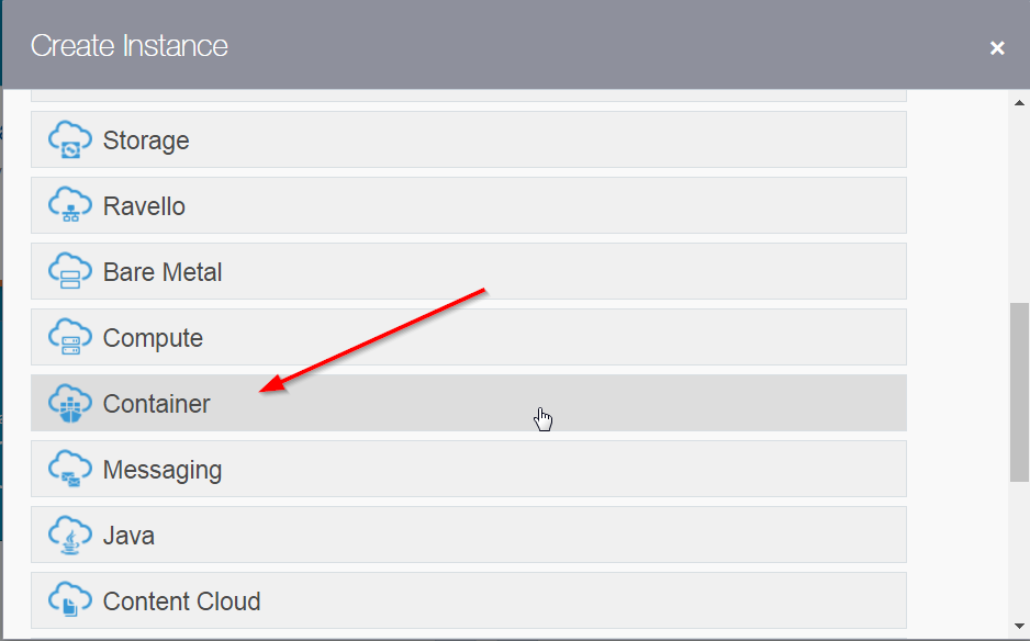 Pick the Container (cloud service), which brings you to the first page of the wizard for creation of the Container Cloud Service: