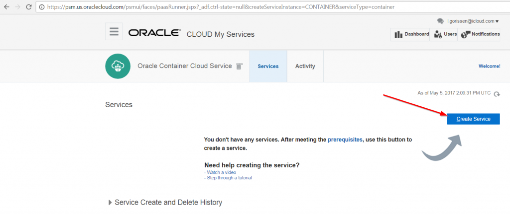 First step is to create an Oracle Container Cloud Service. Start by logging in as Identity Domain Administrator. When you have a trial account, you will have received a mail like the one below: