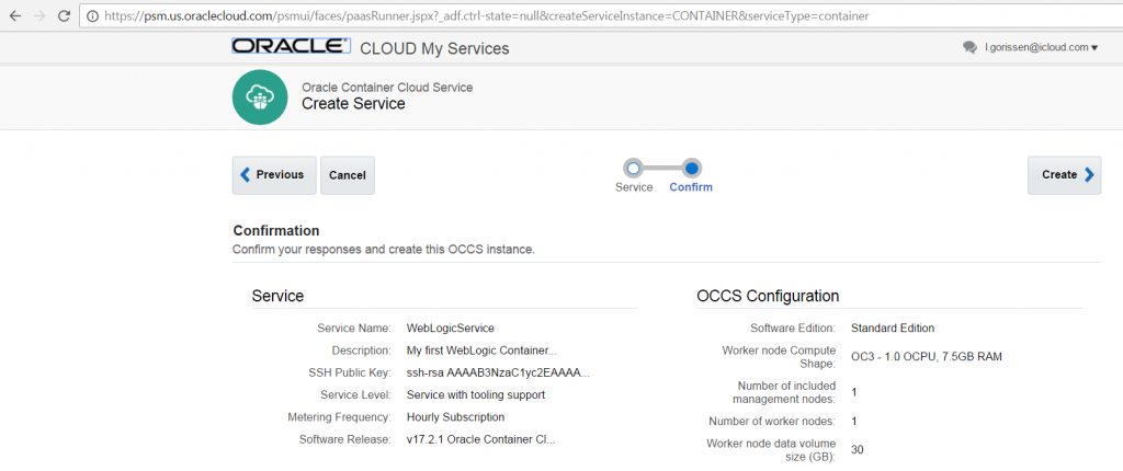 Click on the ‘Create Instance’ to start provisioning fo the Container Cloud Service. A pop-up is now shown: