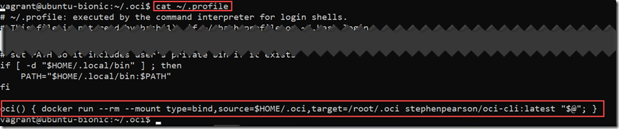 We did not install the OCI CLI on the Docker host – but we can still make it possible to run the CLI commands as if we did. If we edit the .profile file to associate the oci command line instruction on the Docker host with running the OCI CLI Docker image, we get the same experience on the host command line as if we did install the OCI CLI.