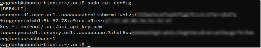 This command will start a dialog that results in the OCI Config file being written to /root/.oci inside the container and to ~/.oci on the Docker host. The dialog also result in a private and public key file, in that same dircetory.