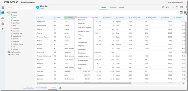 Here is the Data Preparation page in the project. We can review the data, see what is there, modify the definition of attributes, prescribe a certain treatment (conversion) of data, add (derived) attributes etc.