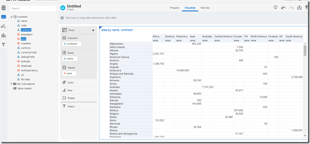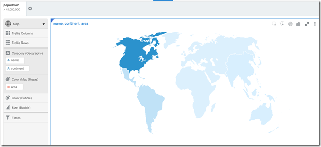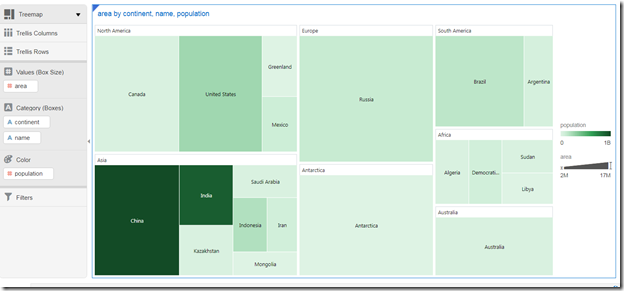 DVCS recognizes the names of continents and countries as geographical indications and can represent them on a map, using color for total area. Let’s remove continent from the Category dimensions, and let’s set bubble size for population: