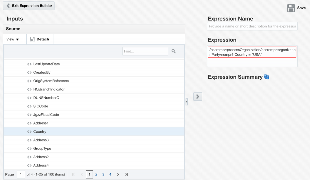 E.g. the expression for filtering on the country of the organization: /processOrganization/organizationParty/Country = “USA”