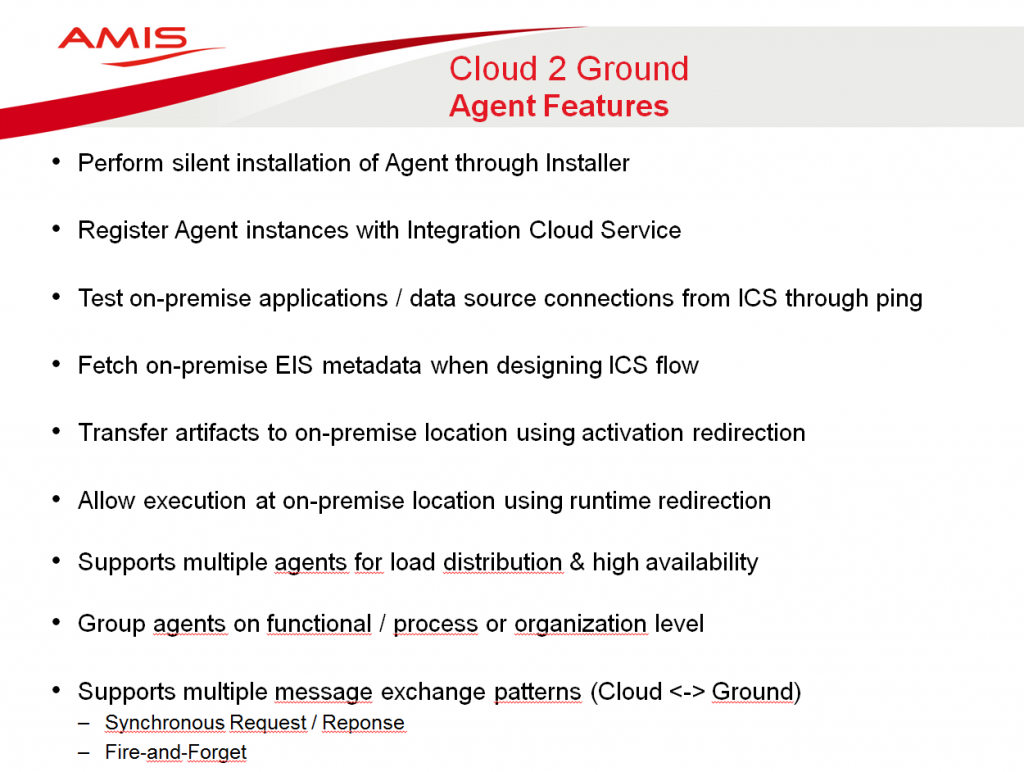 The Agent consists of two components; one Cloud Agent installed on ICS & one Ground Agent installed at on-premises. The Agent uses the Messaging Cloud for message exchange between cloud and on-premises. It only allows connections established to Oracle Cloud. It dis-allows explicit inbound connections for 3rd party consumers. At the core the Agent uses the JCA adapter framework to invoke on-premises endpoints.
