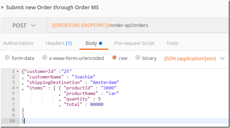 Creating new orders is supported through POST operation on the REST API exposed by the Order microservice: