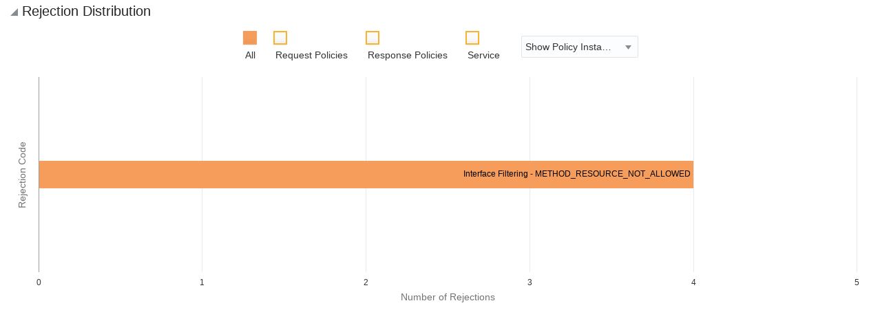 Next, click on icon “Error and Rejections (4 Total)” and if we look, for example, at “Rejection Distribution”, we can see that there were 4 request rejections, because of policy “Interface Filtering”.